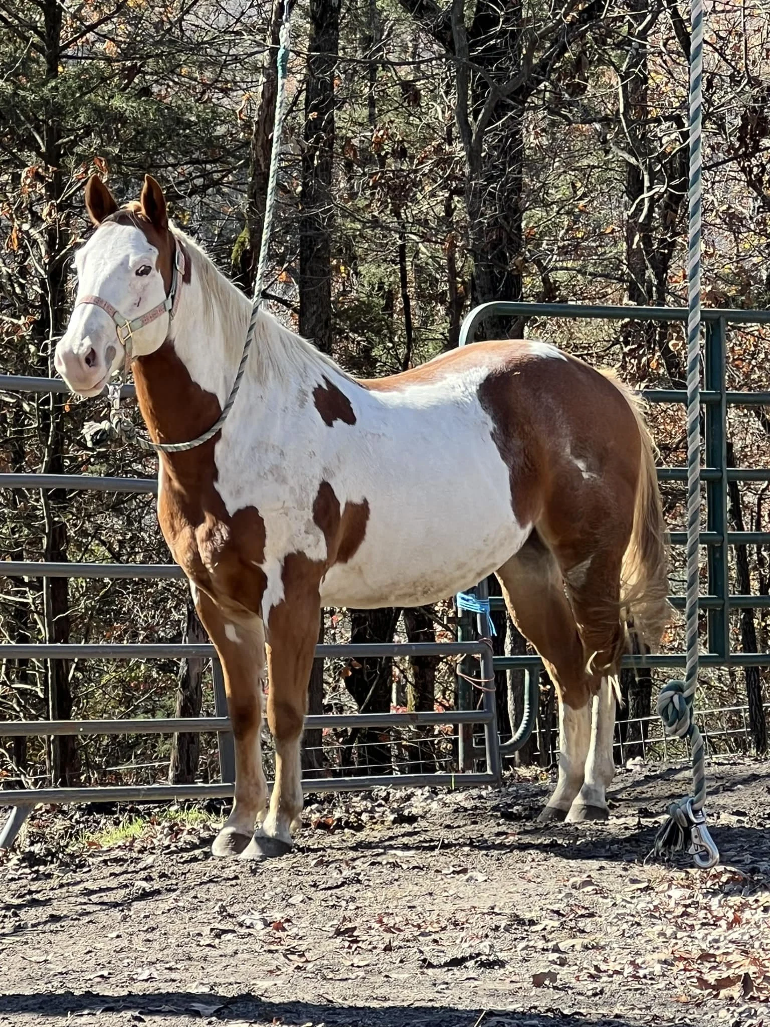 Aries was one of a group called the Lucky 13, a herd of mustangs rescued in the winter of early 2024. She came in as a surrender with law enforcement assistance. Although completely emaciated and weak, she was a sweetheart from the start. She was one of the only mustangs who wanted human attention when she arrived, always eager to take food out of your hand or be pet. She never stopped fighting or wanting love, even after humans had failed her. She was broke to ride upon arrival, but required a lot of weight gain and nourishment before her body would be strong enough to handle a rider. She excelled quickly in her training, as she surprised us with her groundwork knowledge and riding ability, but her skills were finetuned. Today, she has a happy home with a family who loves her!